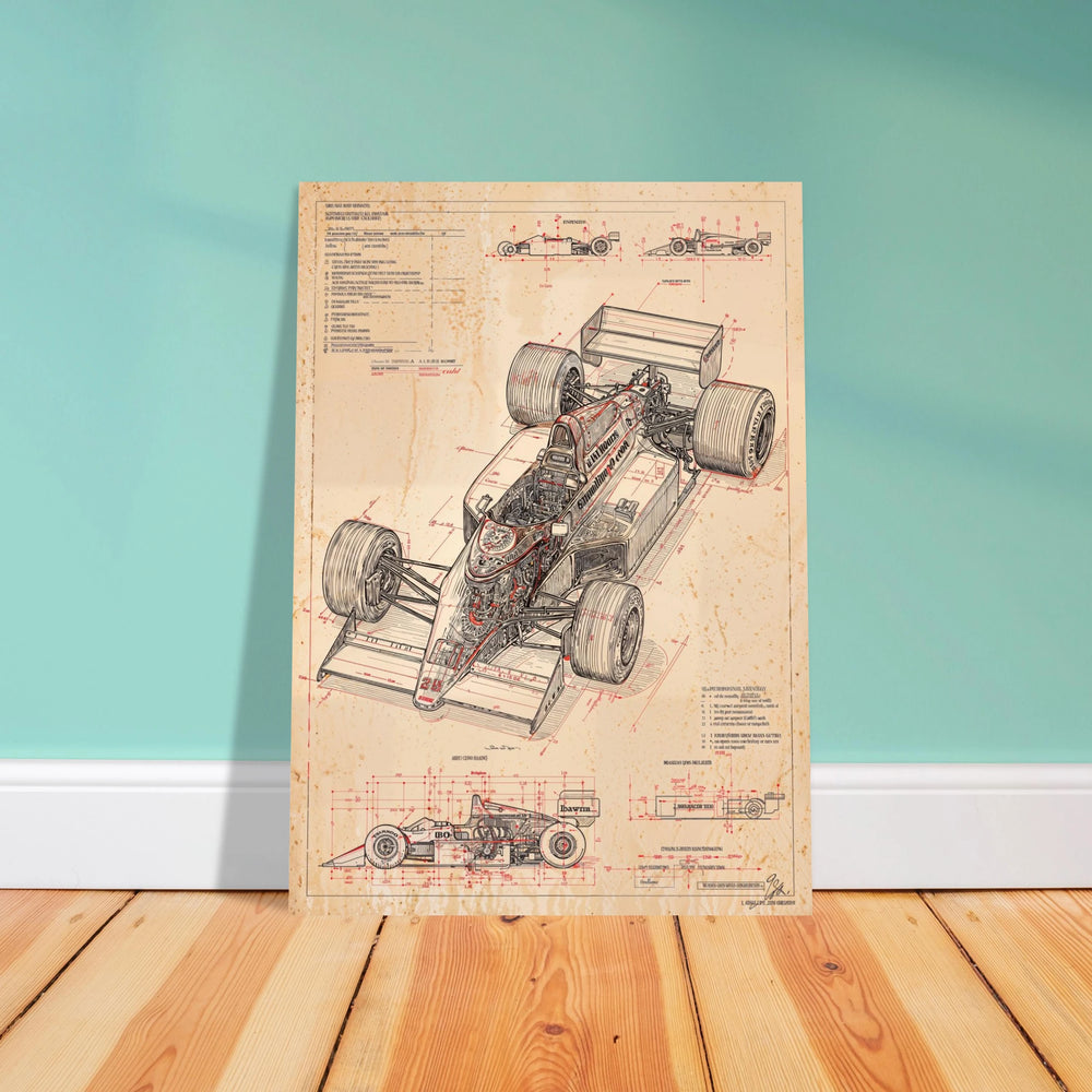 Nota de ingeniería: El McLaren MP4/4 es la personificación de la sinergia aerodinámica y mecánica. Este plano técnico deconstruye el coche que logró un 93,7% de victorias en la temporada de 1988. El estudio se centra en la arquitectura de chasis de perfil ultrabajo y el legendario motor Honda RA168E V6 Twin-Turbo.